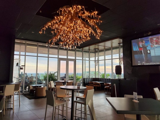 Cocktails and sophisticated dining on the 17th floor of the Doubletree Hilton with live music.