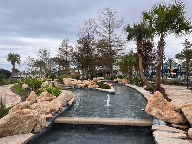 Dog-friendly park featuring fountains, a playground and a riverwalk.