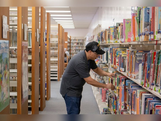 Quaint library, offering a playground, reading programs and computers.