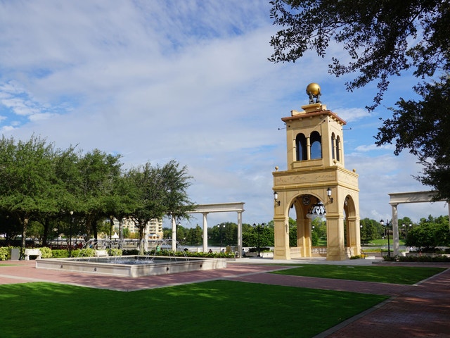 Lakeside area featuring a walking path, plaza with fountain show & amphitheater for outdoor events.