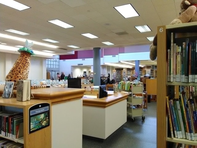 Public library offering materials such as books and movies, plus a copy machine.