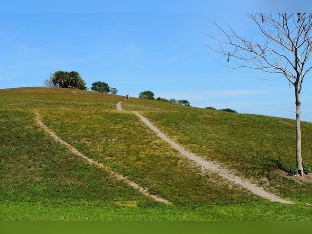 Rolling hills & fitness trails offer exercise opportunities with picnic shelters & playgrounds.