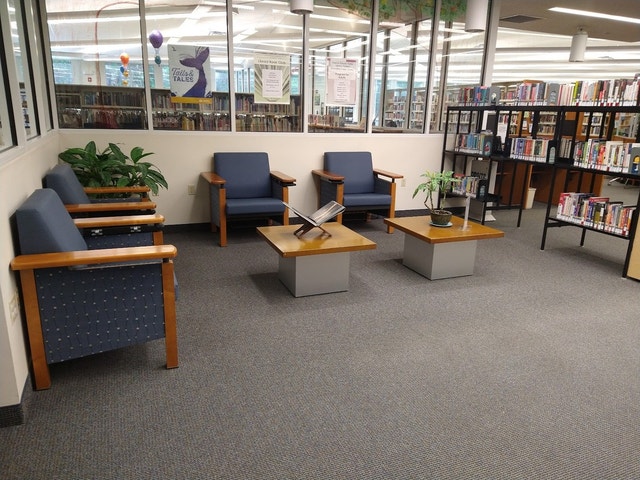Community library featuring a children's area, study rooms, self-checkout, and public events.