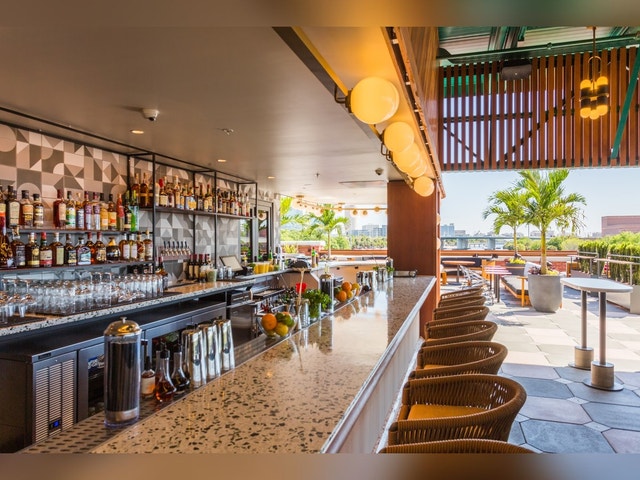 Upscale rooftop spot offering tropical cocktails & elevated sharing plates, plus city & river views.