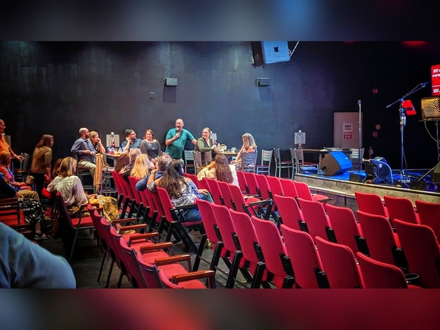 Various performances are staged in a smaller space with black walls, Tiered seats & a corner bar.