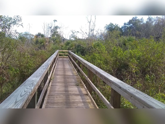 Modest park, featuring exercise equipment, boardwalks and hiking trails through verdant woods, as well as picnic tables.