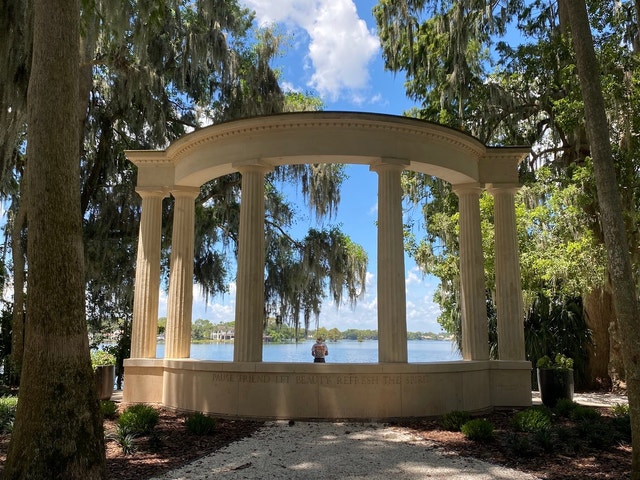 5.2-acre secluded lakefront public grounds featuring the Exedra Monument & massive cypress trees.