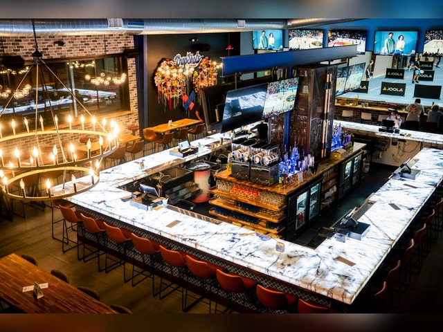 Indoor facility for pickleball that's part of a market, with a bar and restaurant attached.