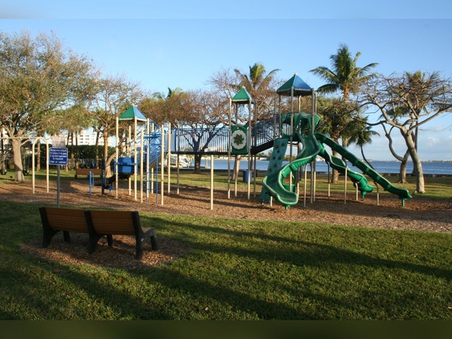Park featuring a playground and picnic tables, plus a public restroom and fishing.