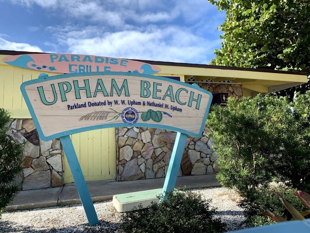 Wide, white sandy beach backed by dunes, known for dolphin sightings & light surfing.