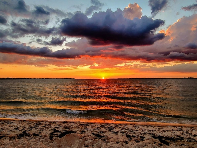 Narrow palm-lined park & beach on a man-made island where people fish, kayak, windsurf & swim.