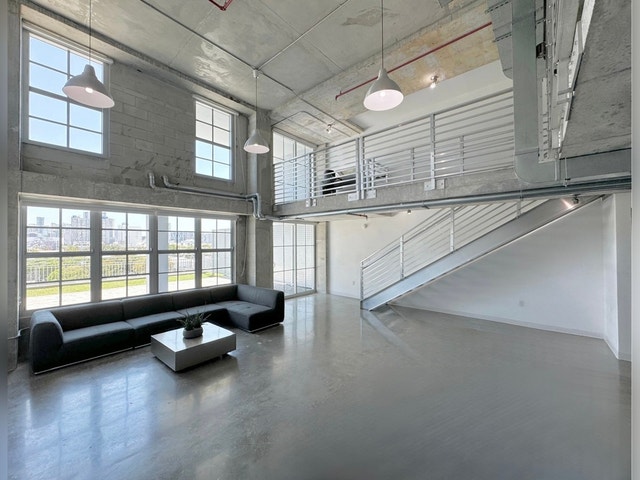 Modern, well-equipped photo studio with high ceilings and views of downtown Miami, plus a balcony.