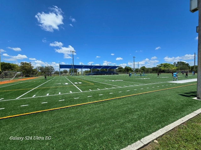 Spacious green space for soccer and football, with a playground and a gym.