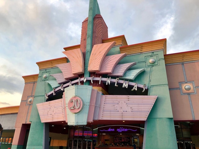 Theater complex with multiple screens featuring new release films, plush seating & concession stand.