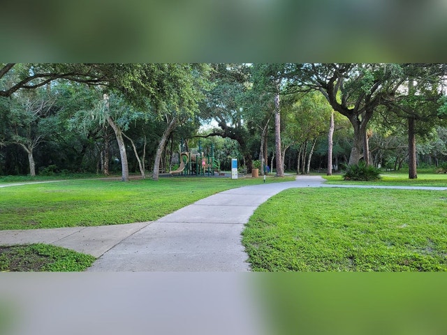 Dog-friendly park with wooded walking trails, kids' play structures & picnic facilities.
