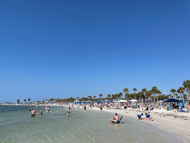 Happening park located on the Gulf of Mexico draws a bustling crowd for the beach & swim area.
