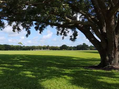 Sports, recreation, loop path & picnic areas amid stone structures & a fountain on 75 acres.