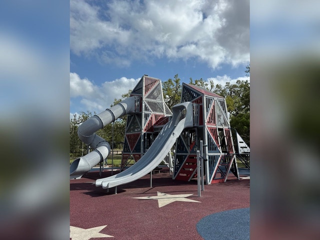 Kids' park featuring a splash pad, playground, barbecue grill and picnic tables.