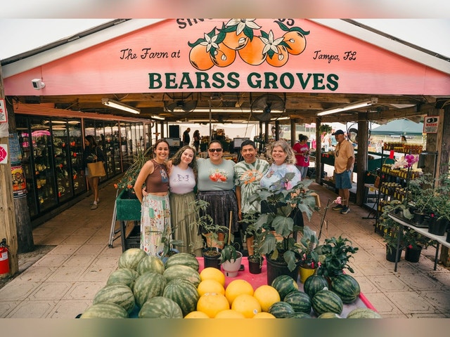 Produce market featuring fruits, veggies, and organic products, plus eggs and milk.