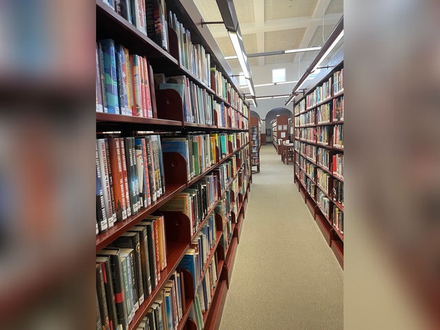 Public library with a children's section offering books, DVDs, learning activities, and play areas.