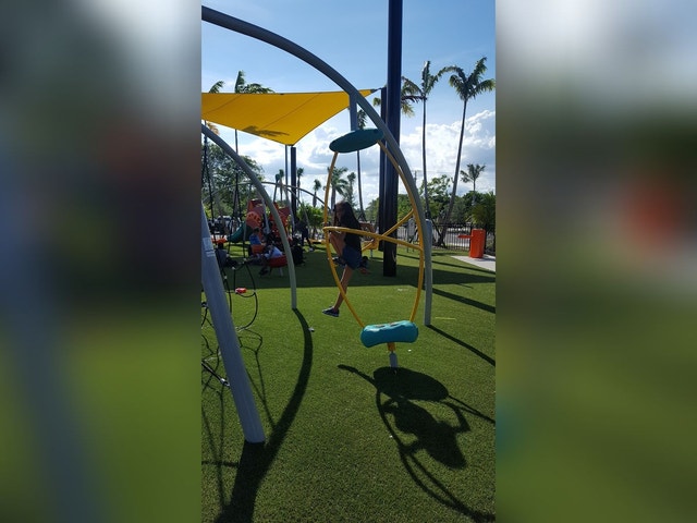 Recreational area with a playground, picnic tables, tennis and basketball courts, and a community center.