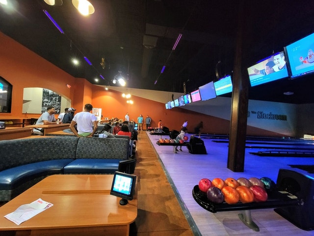 Bowling alley providing laser tag and an arcade, plus karaoke and cornhole.