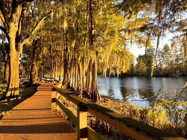 Relaxed green space featuring a playground and river views, plus boat ramps and fishing.