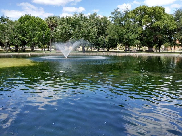 Enduring public green space featuring play equipment, a basketball court & picnic tables.