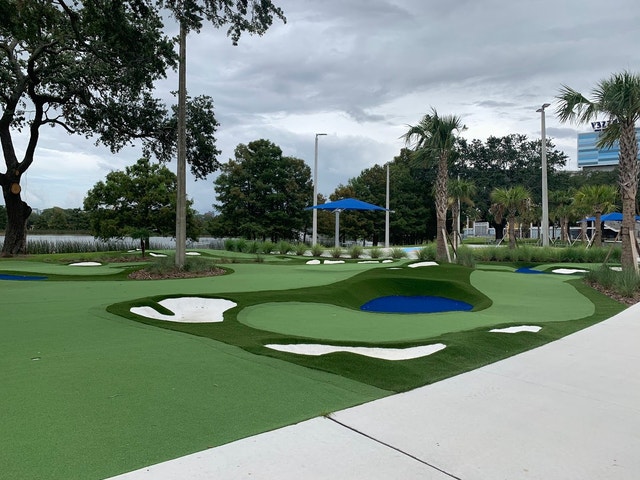 Park featuring mini-golf, a splash pad, fishing, basketball, and a playground, plus picnic areas.