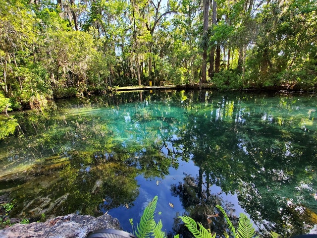 Hiking trails lead to a natural spring with a dock and swimming, plus picnic areas.
