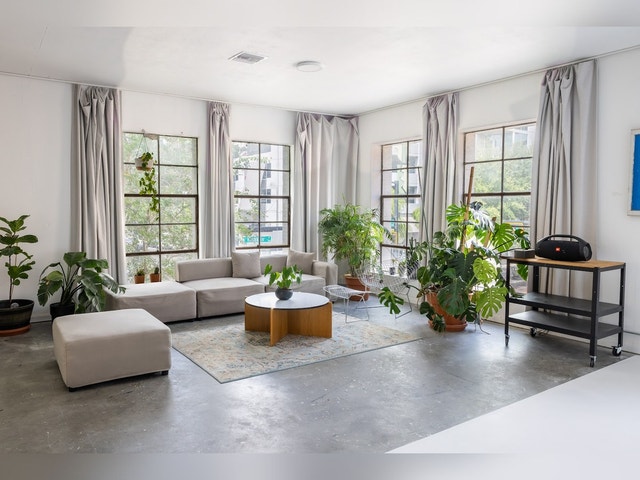 Creative space, specializing in studio rentals, featuring a cyc wall, props, and lights.