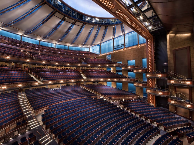 Large, multilevel performing arts venue showcasing Broadway plays, concerts & dance performances.