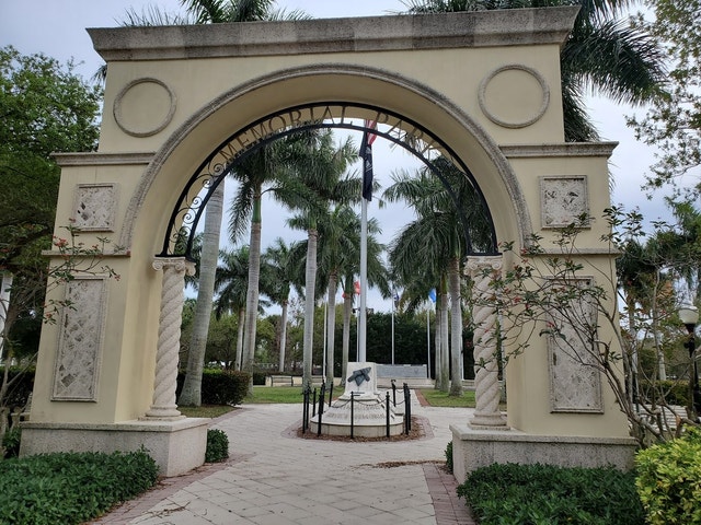 Tranquil park offering grassy areas, foot paths, a pond with a fountain & U.S. war memorials.