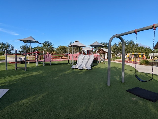 Waterfront park with a sports center, café, pavilions, boat launch, play & splash areas & golf.