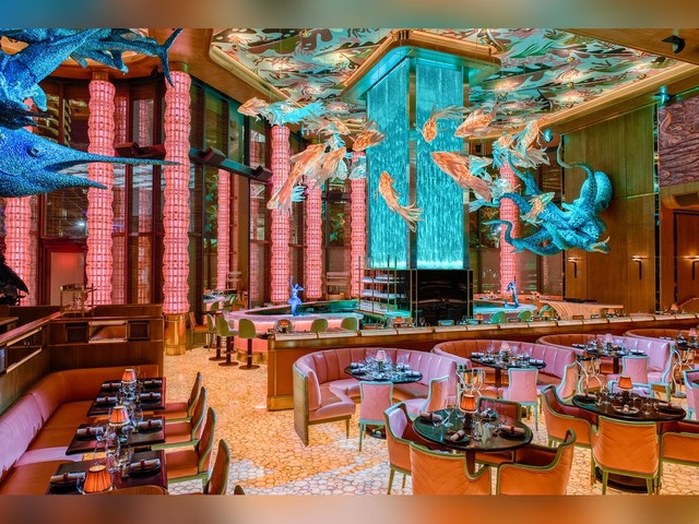 Chic, luxurious Asian restaurant and nightspot with surreal fish lamps designed by Frank Gehry.