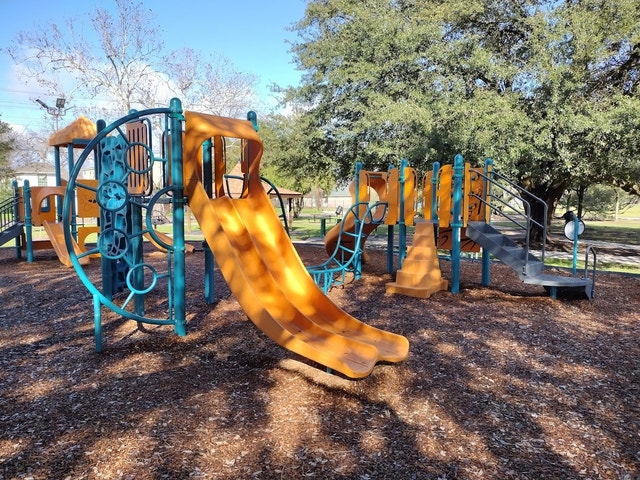 Manicured neighborhood park with swings, slides and a basketball court.