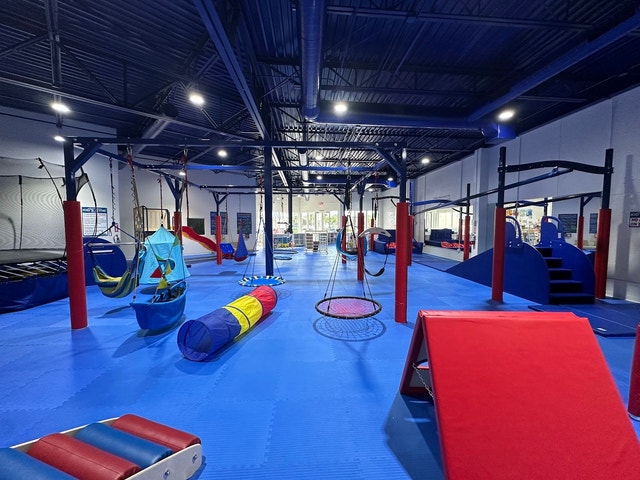 Indoor playground with a zip line, trampoline, and play structure, plus sensory-friendly offerings.
