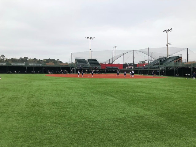 Sports complex featuring fields for baseball and softball, plus covered stands and a snack bar.