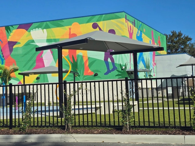 Recreation center offering a basketball court, plus a public restroom.