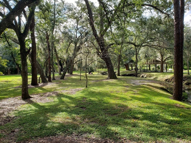 Public park with a playground, picnic tables, winding paths, and pavilions.