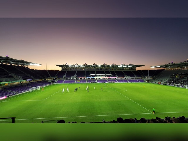 Stadium hosting Orlando City soccer matches and other events, featuring food and merchandise.