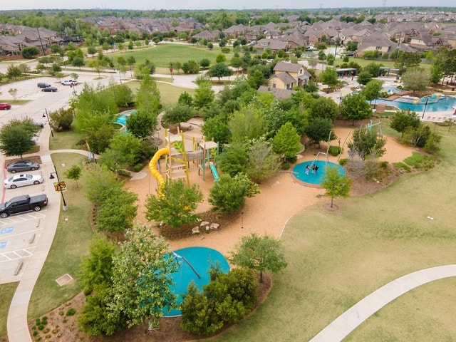 Neighborhood park with a playground, picnic tables, volleyball court, and lake views, plus a party hall.