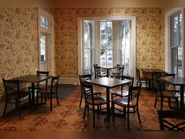 Coffee, wine & beer, plus sandwiches & salads, in a cozy Victorian building with a porch.