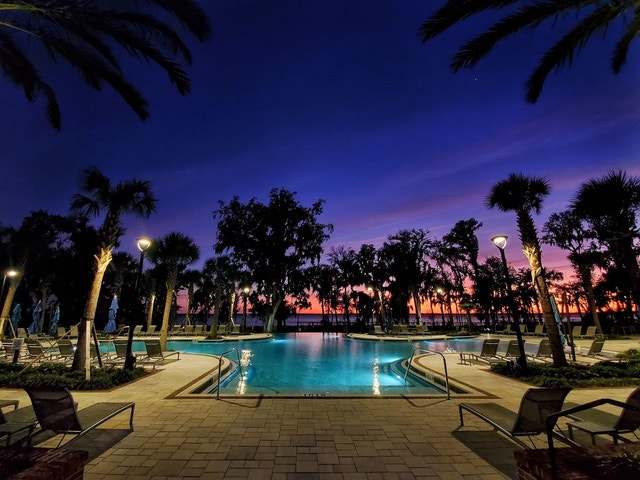 Housing developer with a pool and river views, plus events such as karaoke nights and trivia.