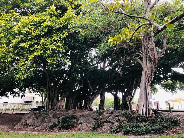 Neighborhood oasis featuring a variety of trees, including ficus and palm varieties.