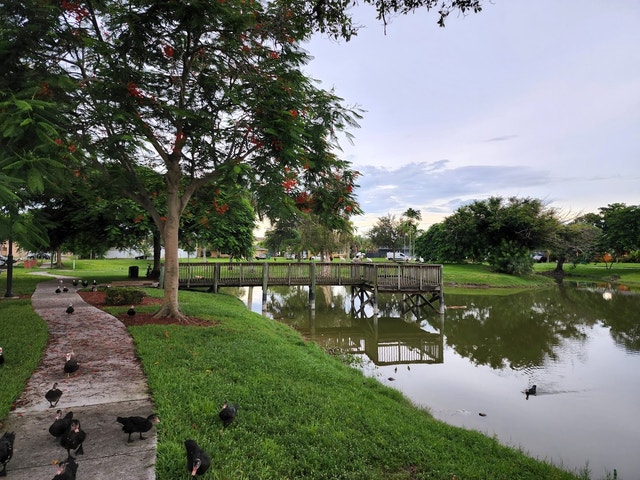 Park with a playground and tennis court, plus wildlife such as turtles and birds.